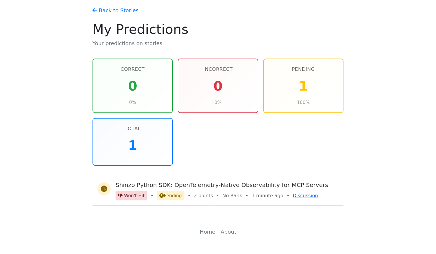 - I need to find a way to make it more fun in the short term, like predicting within a few minutes whether you were right based on the trajectory of HN guesses (e.g., the story has no upvotes after 5 mins, so it probably won’t hit)